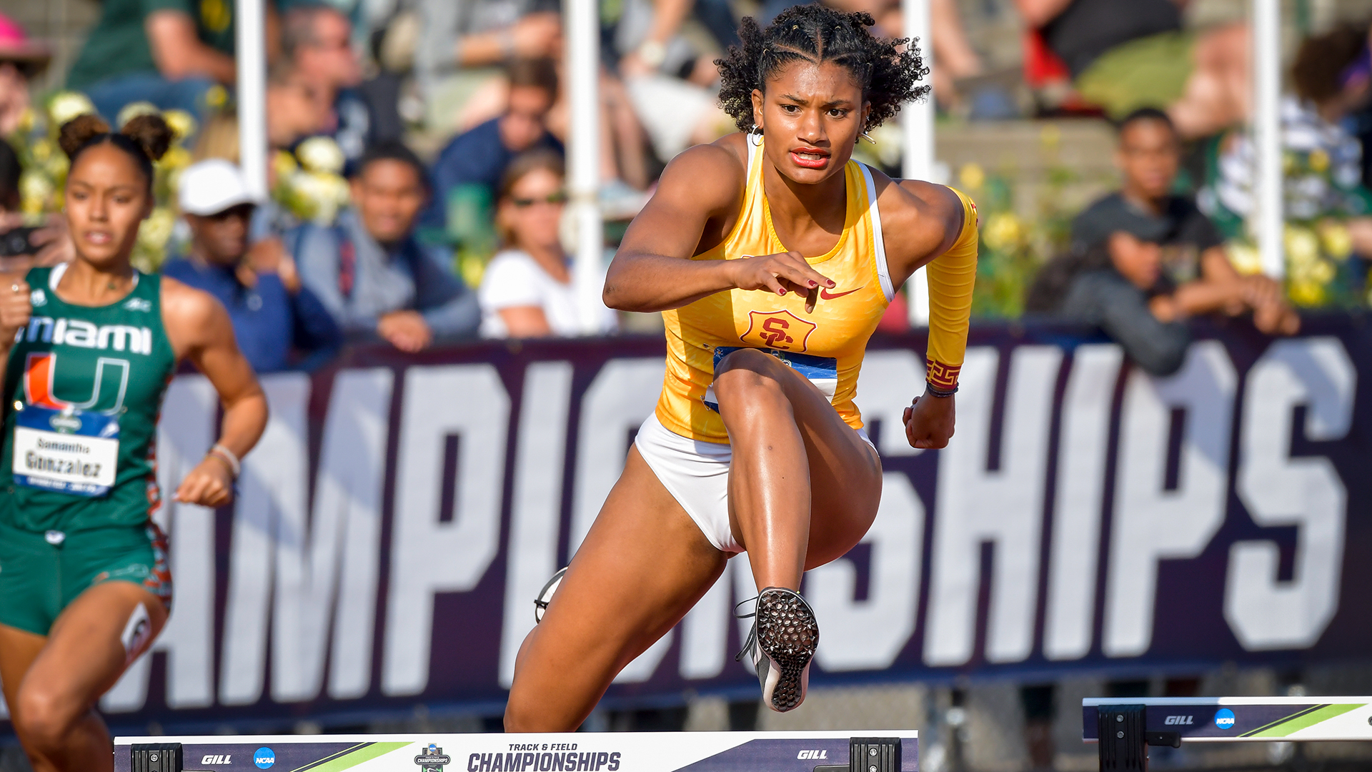 2017: She opened her USC 400m hurdles career at the Battle on the Bayou with a time of 55.51 to take 2nd, move to 4th on USC's all-time list and set the freshman school record.  Before the season was over, she would earn Pac-12 Women's Freshman of the Year honors, as well as All-America honors.  She posted a USC freshman record of 55.14, placing 8th at the USA Championships.  In between, she placed 2nd at the Pac-12s with a time of 55.54 and 2nd at the NCAA Championships with a time of 55.36....that time moved her to 3rd on USC's all-time list and she became USC's second freshman All-American in the event.  She placed 2nd in the 100m HH with a time of 13.06 (+0.5) at the Pac-12 Championships.  She placed 8th in the event at the NCAA Championships with a time of 12.91 (+1.6). She also ran on USC's Pac-12 champion 4x400m relay which ran a time of 3:29.52.  She also ran on the 4x400m relay which won at the NCAA West Regional with the 2nd-fastest time in school history of 3:26.09.  Placed 4th with a time of 7.99 in the 60m hurdles at the NCAA Championships, a day after setting the school freshman record with a time of 7.98 in the semifinals. Named to the 2017 USTFCCCA All-Academic team.